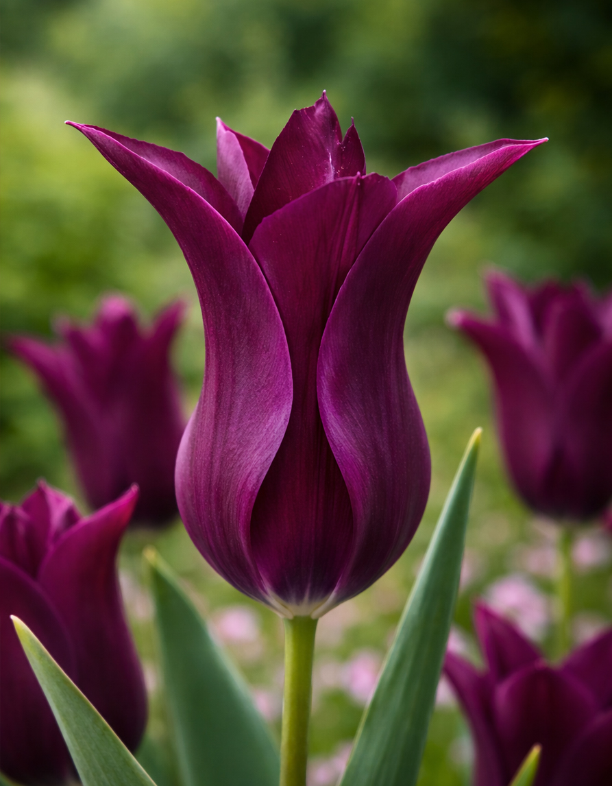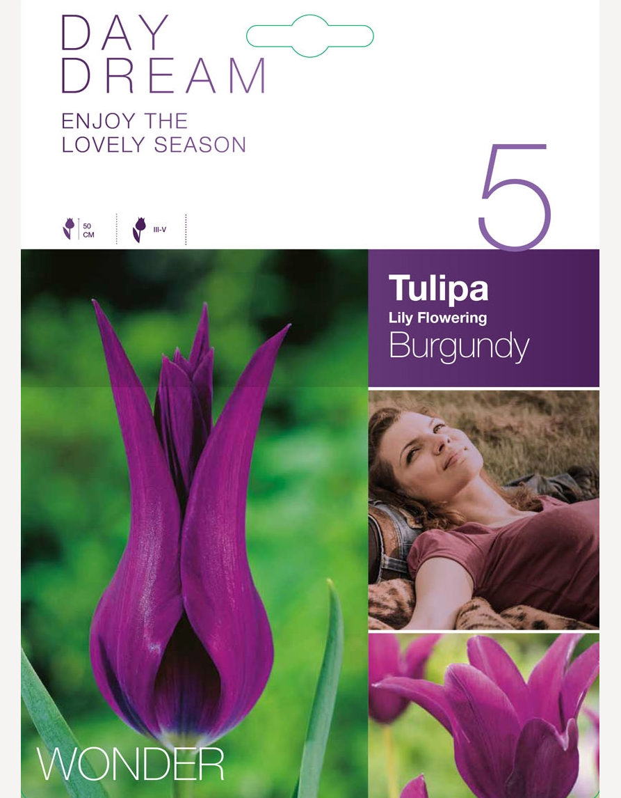 Tulbisibulad ‘Burgundy’ on elegantne liiliaõieline tulp, mille sihvakas õiekuju ja sügav purpur-lilla toon toovad kevadpeenrasse väärikust ja erilisust. Selle sordi iseloomulikud kitsad, teravatipulised ja kaunilt väljapoole kaarduvad kroonlehed annavad õiele õhulise ning peene ilme. Tulemuseks on väga stiilne ja veidi dramaatiline tulp, mis püüab pilku ilma liigse edevuseta.