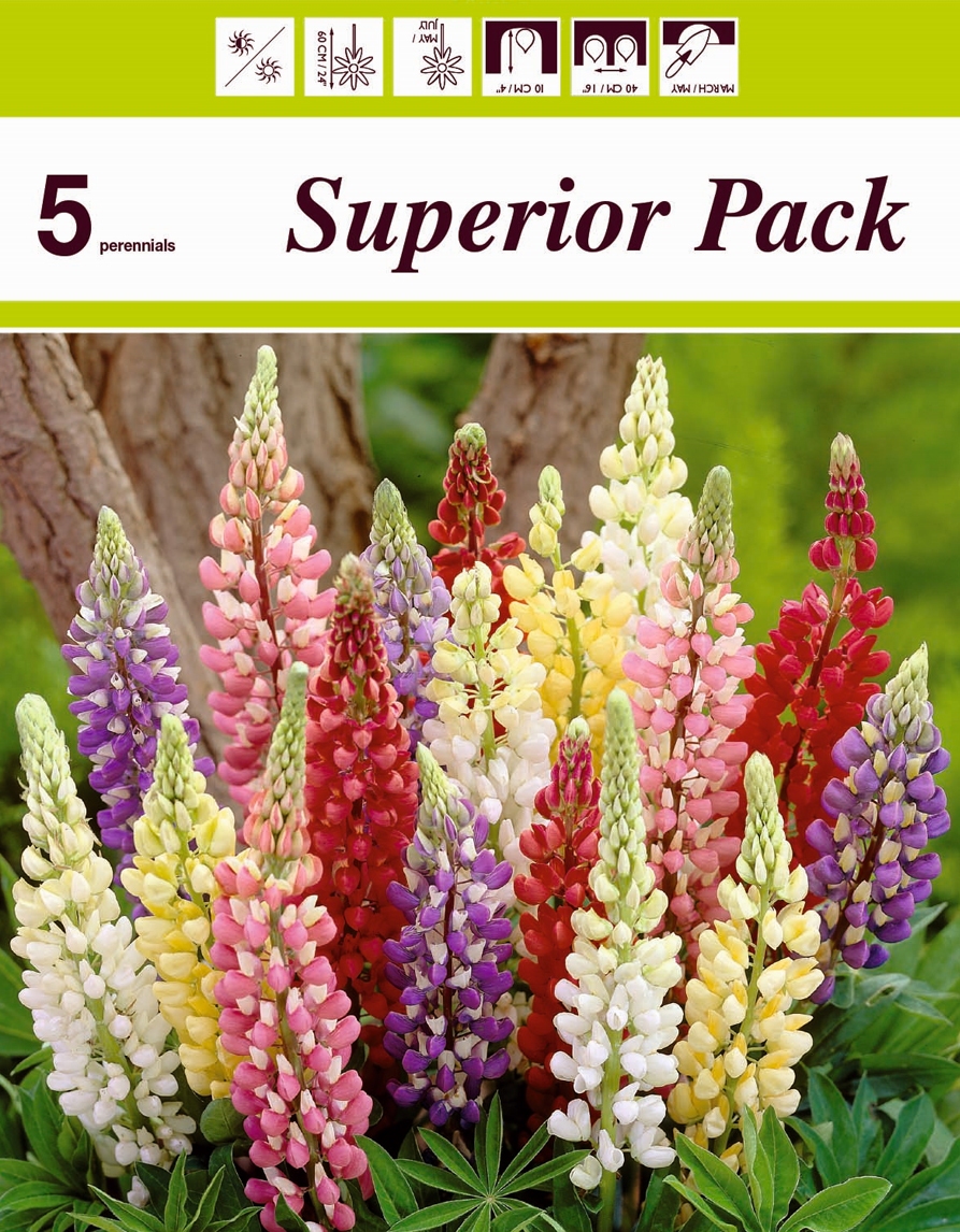 Erksavärviline lupiinide segu toob aeda tõelise suveilu! Pikkades, tihedates õisikutes on rikkalikult toone – valgest ja kollasest kuni roosa, punase, lilla ja siniseni. Need tugevad ja pikaealised püsikud lisavad peenrasse struktuuri ja värvimängu, sobides hästi nii rühmadena kui üksiktaimena.