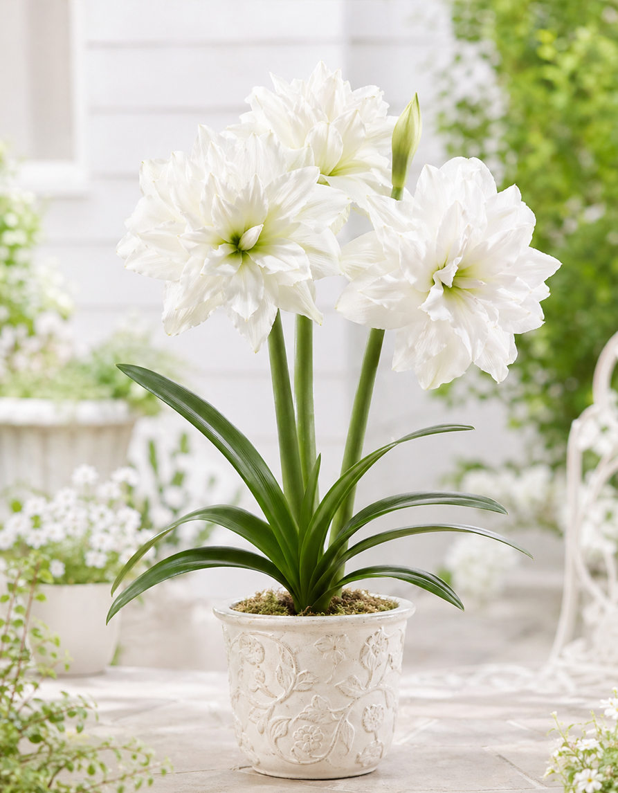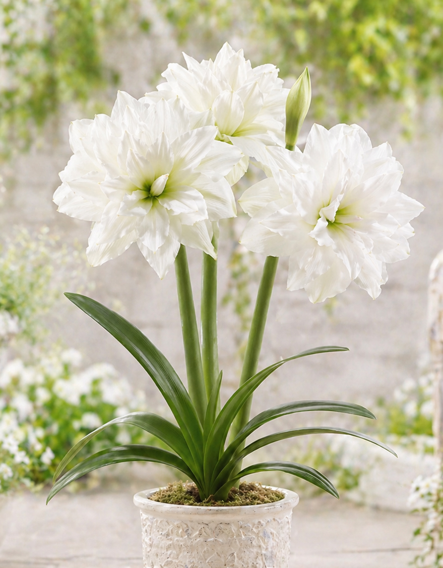 Ratsuritäht ‘Double Galaxy White Peacock’ on elegantne valgeõieline sort, mille suured täidisõied mõjuvad helgelt ja pidulikult. Tähekujulistel õitel on kihilised, õrnalt lainelised kroonlehed ning keskosas kerge rohekaskollane kuma, mis lisab õiele värskust ja sügavust.