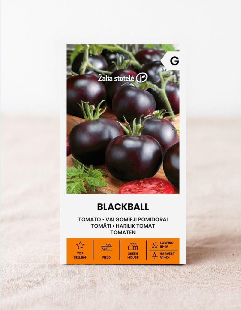 ‘Blackball’ on keskvalmiv kõrge tomatisort, mille viljad on tõeliselt efektse välimusega: mustjas koor ja erkpunane viljaliha loovad pilkupüüdva kontrasti. Ühest kobarast valmib 8–10 ühtlast 50–55 g kaaluvat tomatit, mis sobivad ideaalselt suupistetaldrikutele, ühe ampsu võileibadele või värskesse salatisse.